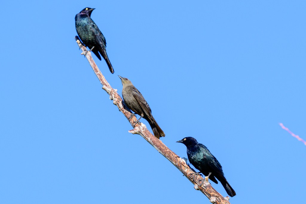 Brewer’s Blackbirds lined up on a dead branch. The males, with their yellow eyes, bracket a female. These birds like to hang out in the Vons parking lot and near the tables at the Great Basin Bakery.