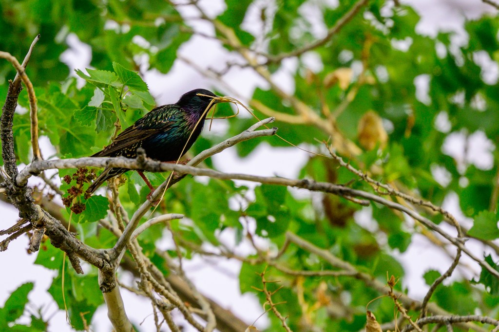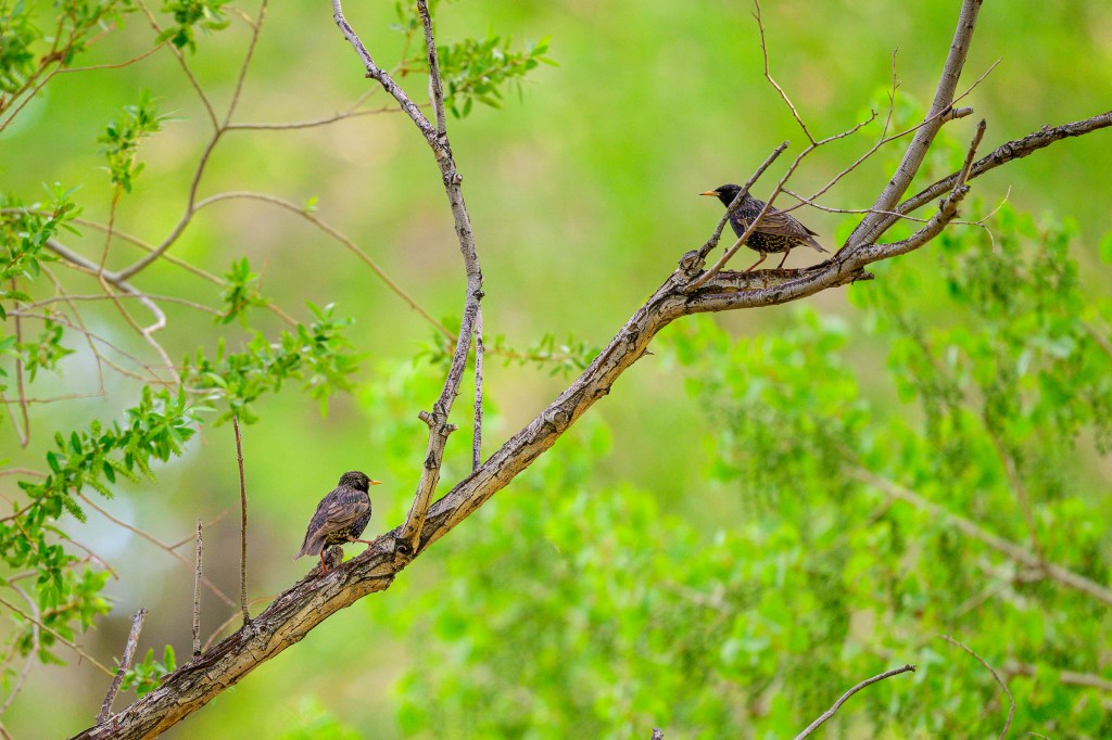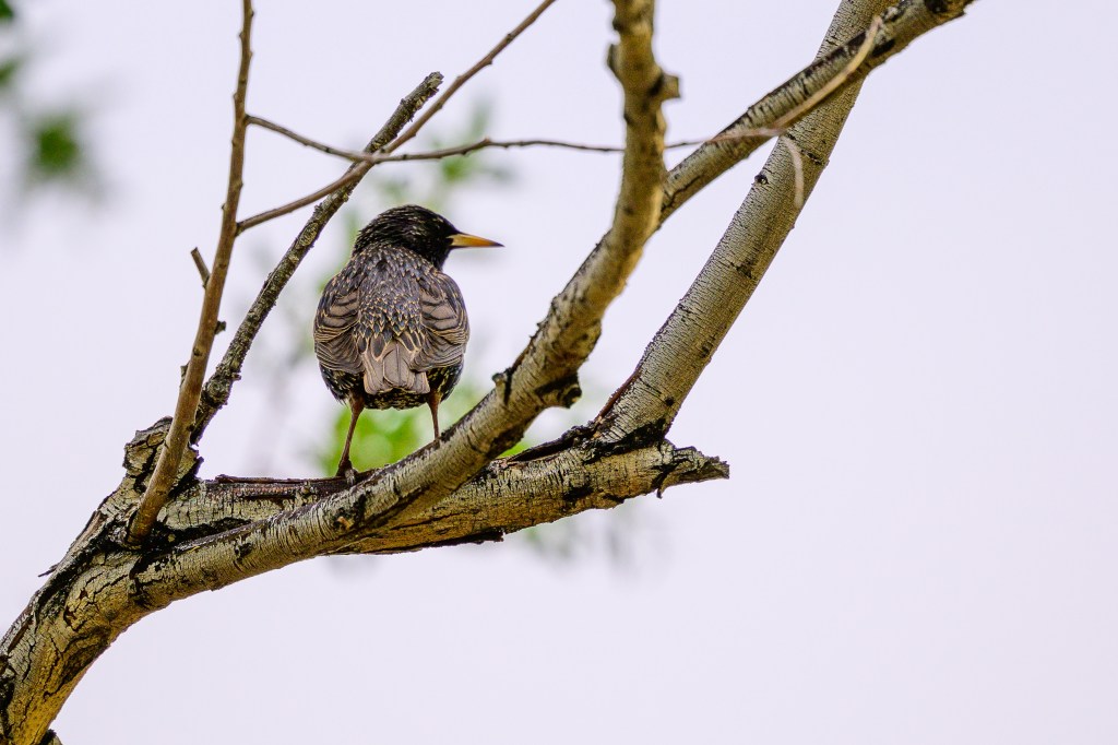 European Starlings are famous for their murmurations in large flocks. I also enjoy the colors of the individual birds. In winter they are covered in bright spots. In breeding season the spots fade, the bird develops glossy feathers, and the bill becomes yellow.