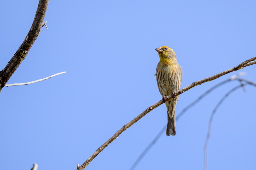 The male House Finch shown below was singing like mad in my neighbor’s front yard. But his color is wrong; he should have bright red feathers on head and upper body. Instead he is yellow. Apparently this Finch cannot produce red feathers because his diet is deficient in certain chemicals that are needed.