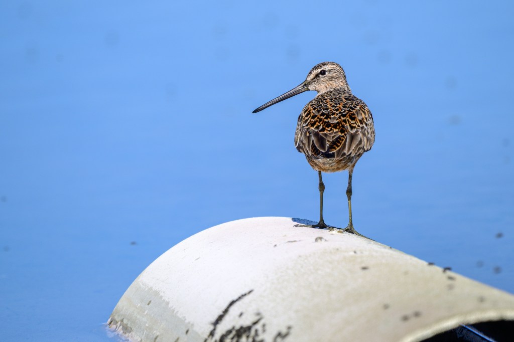 Waterbirds will often dip a wingtip into the water as they fly close to the surface. I used to think this was a minor flight error, like a car dragging its muffler. But I’ve seen this often with many bird species. My thought now is that the bird is tapping the water to assess or maintain its altitude, just as you might rest your hand lightly on a railing on a flight of stairs.