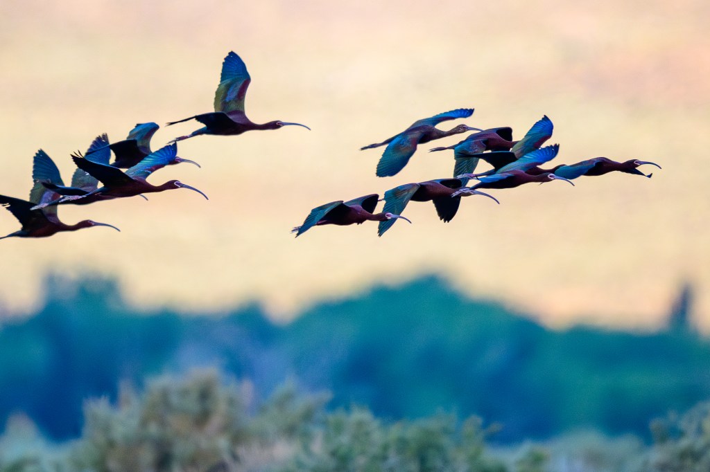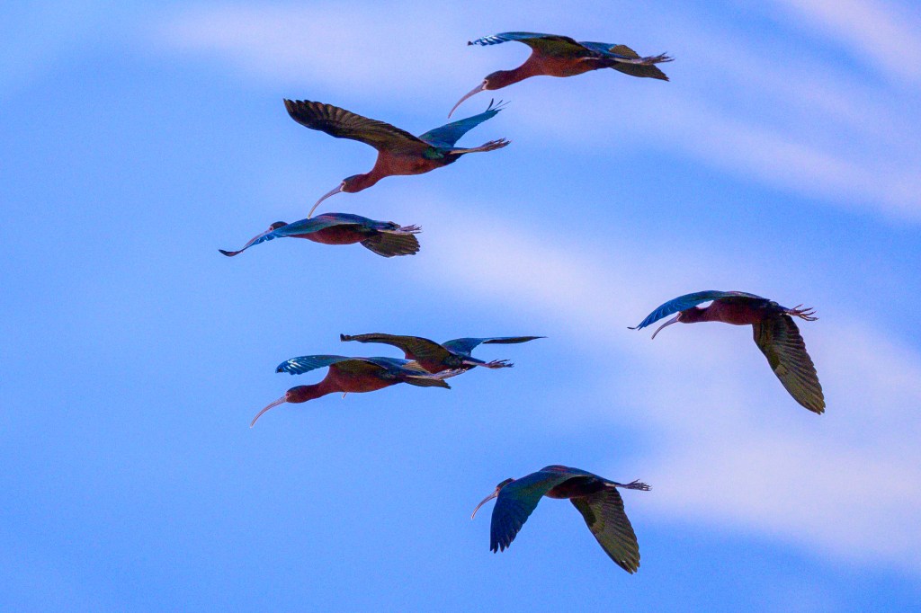 A flock of White-faced Ibis flies north. The name refers to the white rim around their eyes and base of their beaks; this appears during breeding season. Their glossy feathers seem to change colors with the lighting.