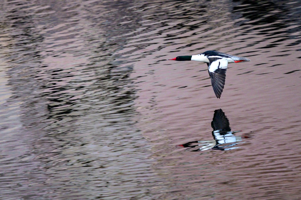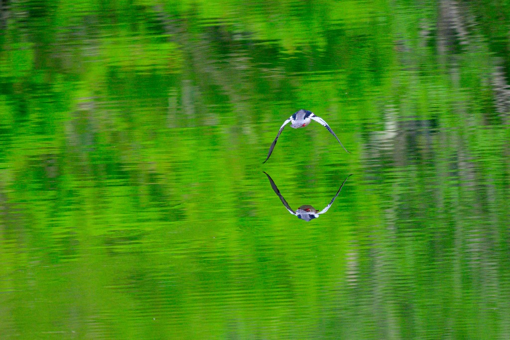 A male Common Merganser streaks over the water. In the second photo, the bird is moving away from us and the water looks green due to reflections from trees. I liked the reflections of the bird in both photos.