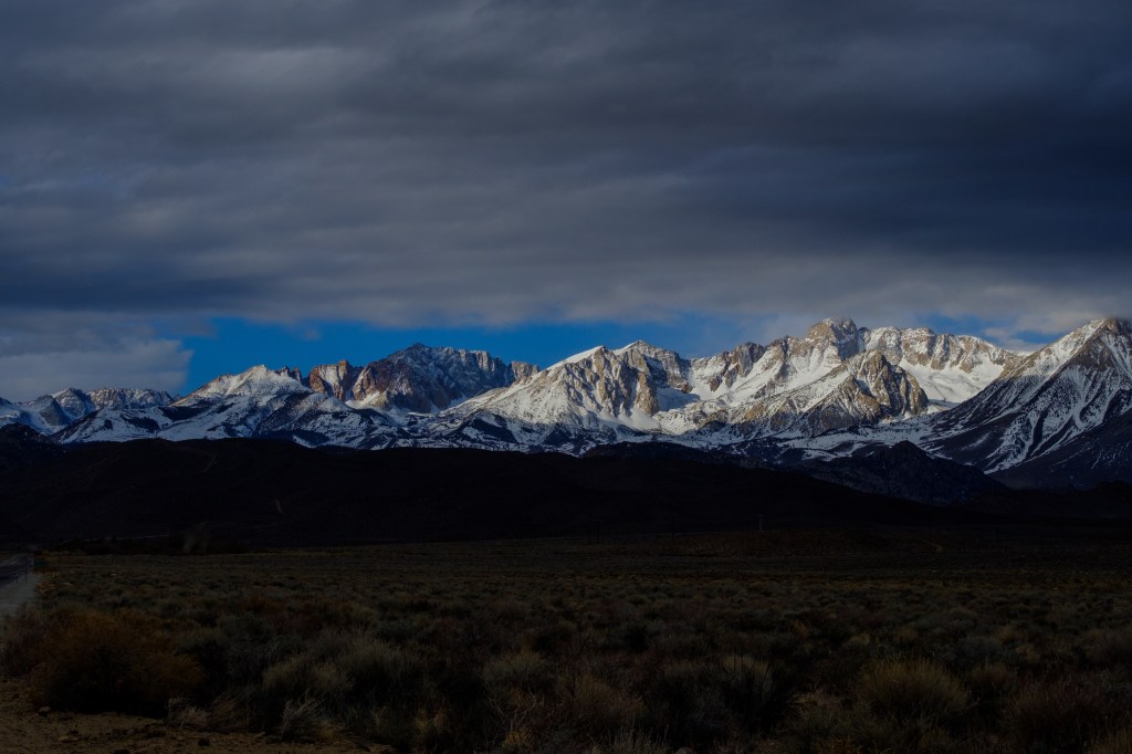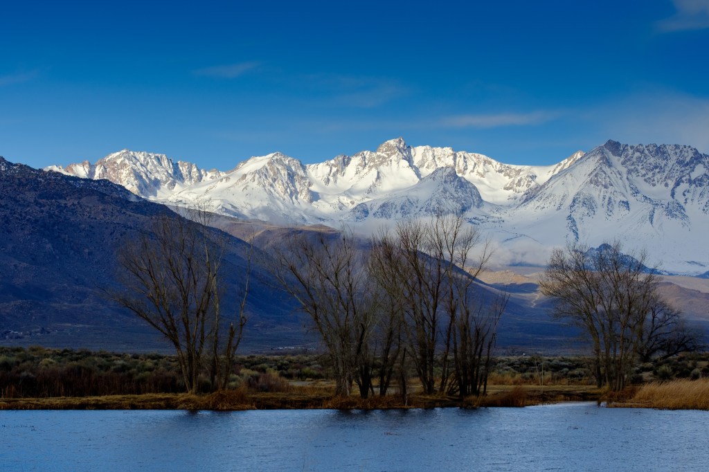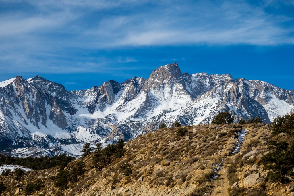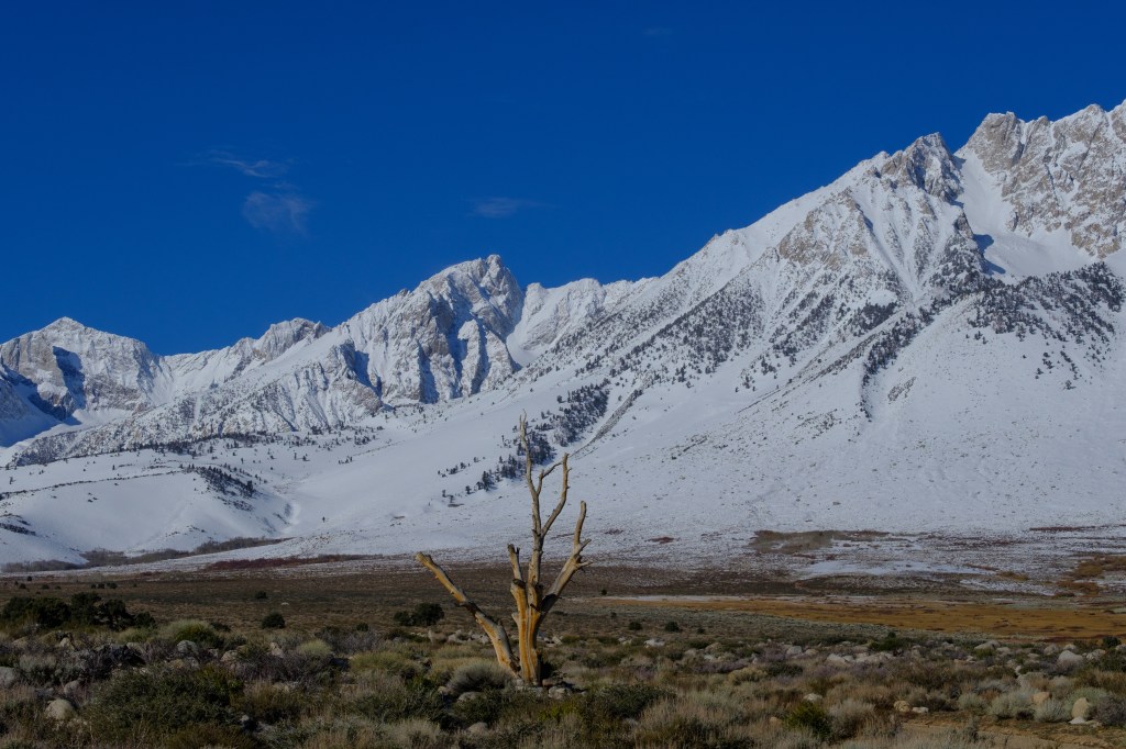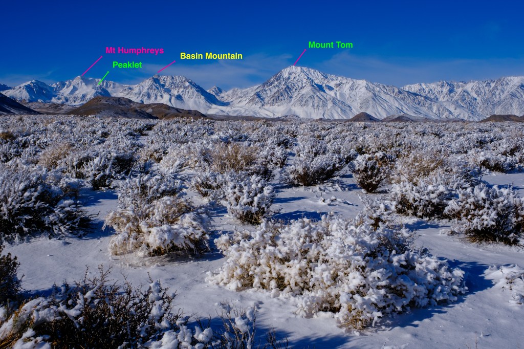 In the photo below, December snow covers sagebrush near Bishop. Mount Humphreys is in the left side of the picture. Basin Mountain (13,187 feet) and Mount Tom (13,658 feet) are lower summits, but they seem taller than Humphreys because they are closer to Bishop. I also labeled “Peaklet” (12,160 feet), a lesser summit that appears in many of my photos because it lies in front of Humphreys. Bishop’s elevation is 4000 feet, so the top of Humphreys is nearly two miles above us.