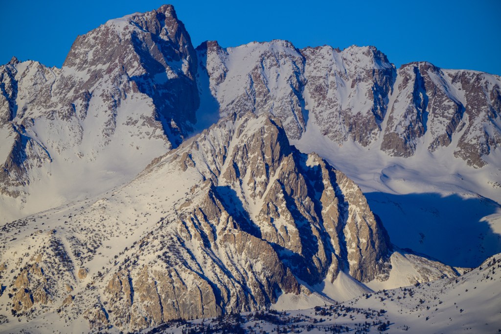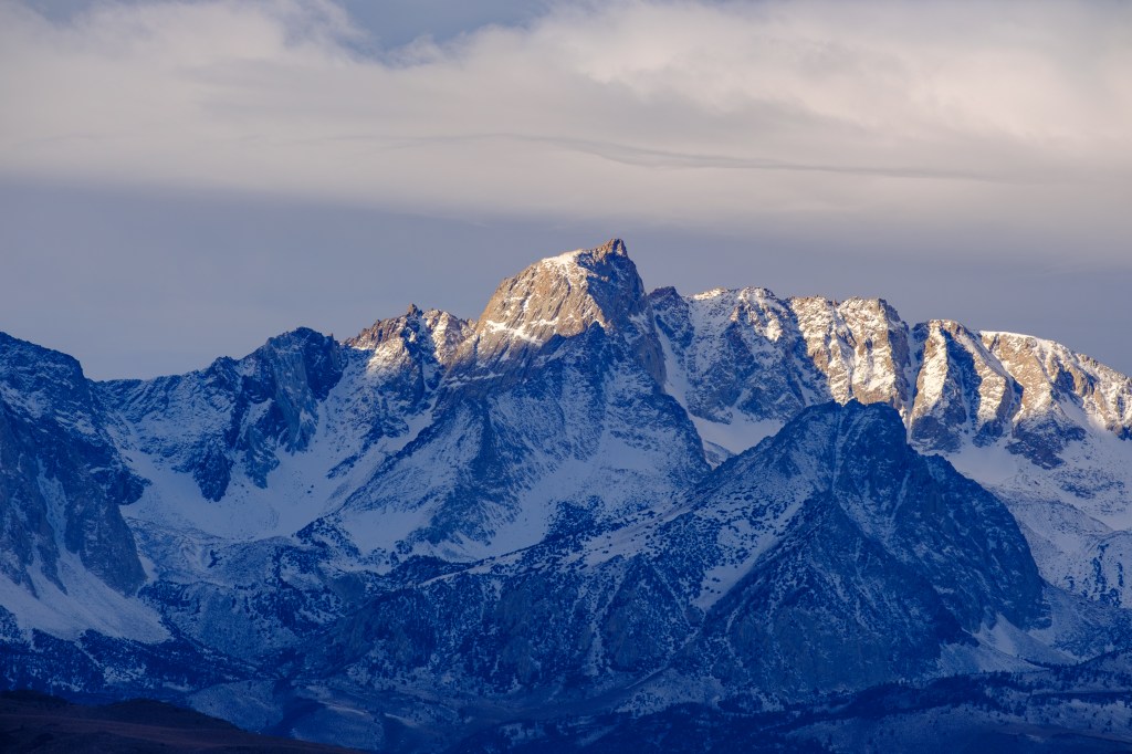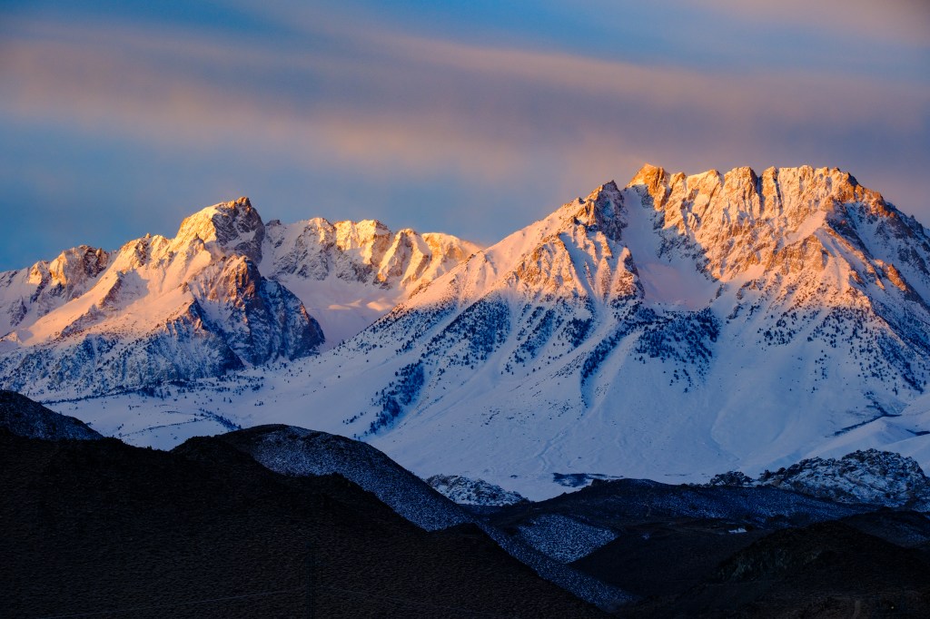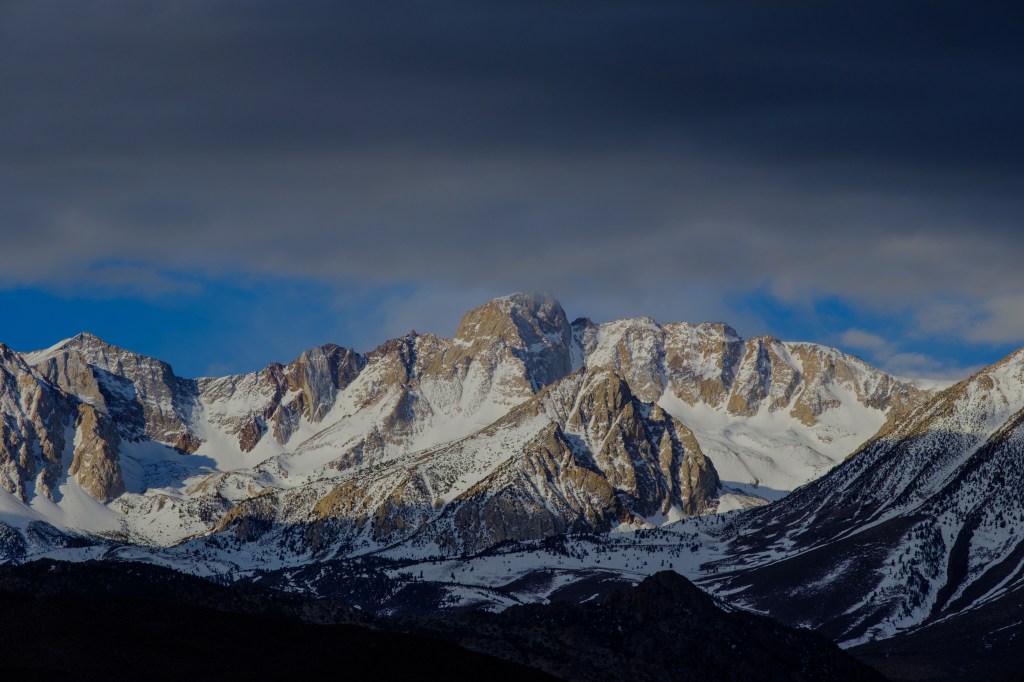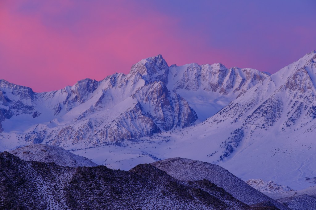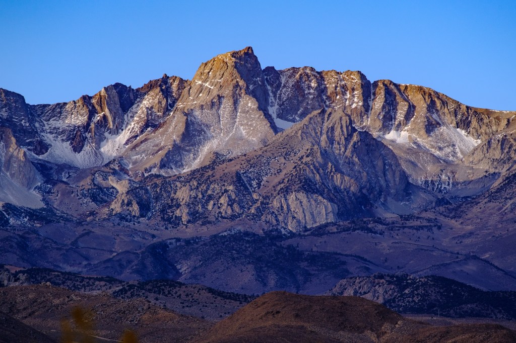 In January, dawn light (7am) touches the top of Humphreys on the left and Mount Tom on the right. Basin Mountain, left of center, is still in shadow because it is lower.