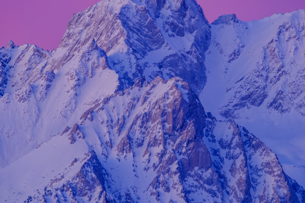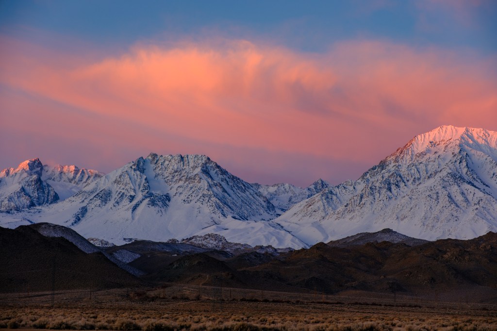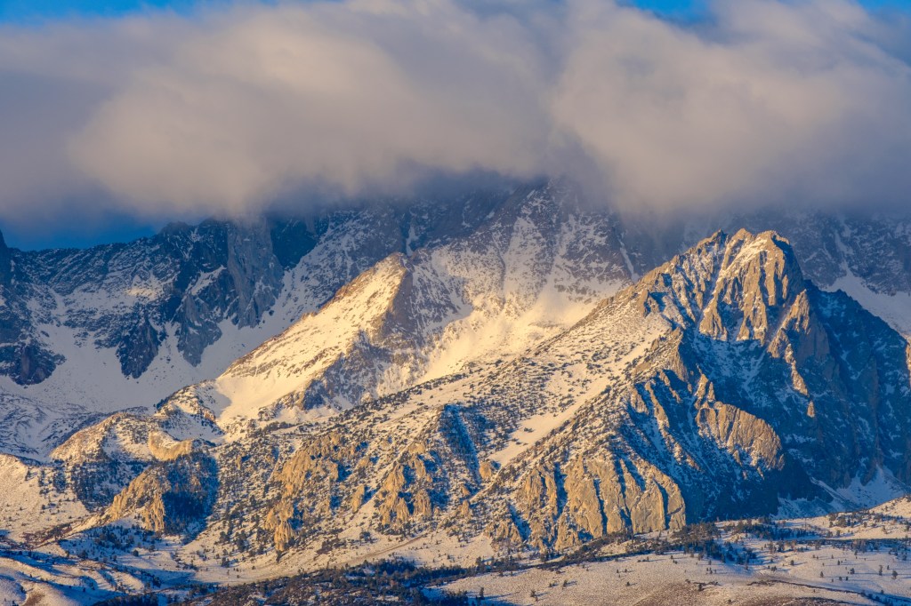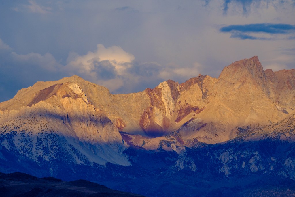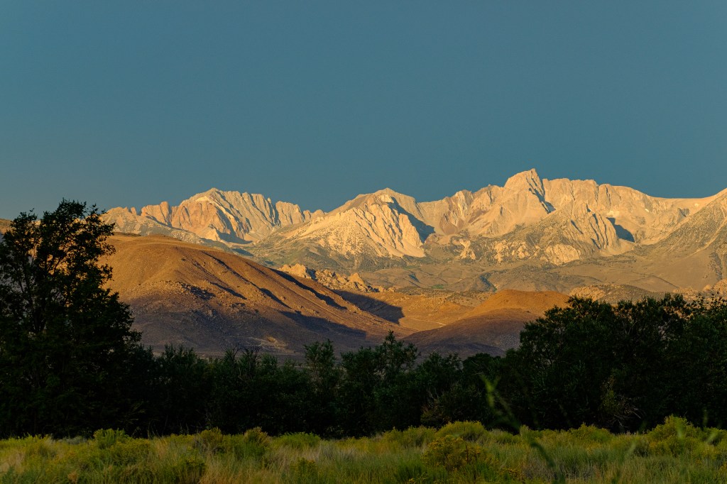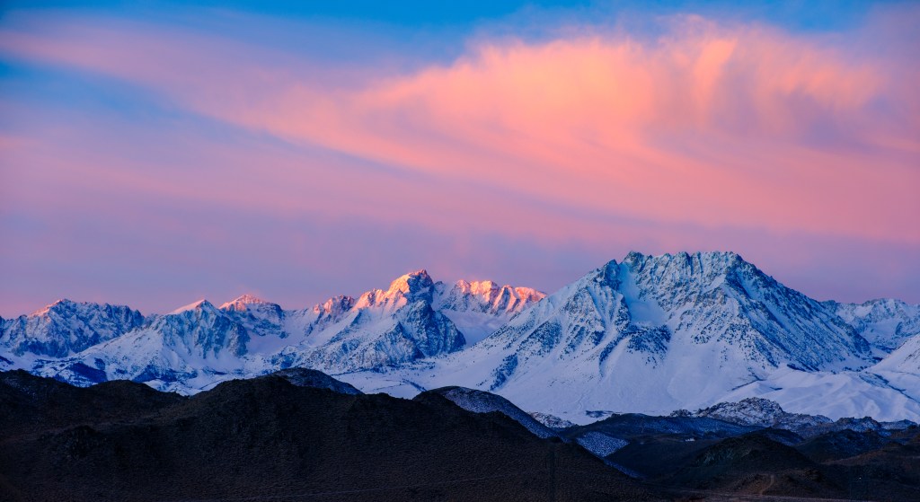 In January, dawn light (7am) touches the top of Humphreys on the left and Mount Tom on the right. Basin Mountain, left of center, is still in shadow because it is lower.
