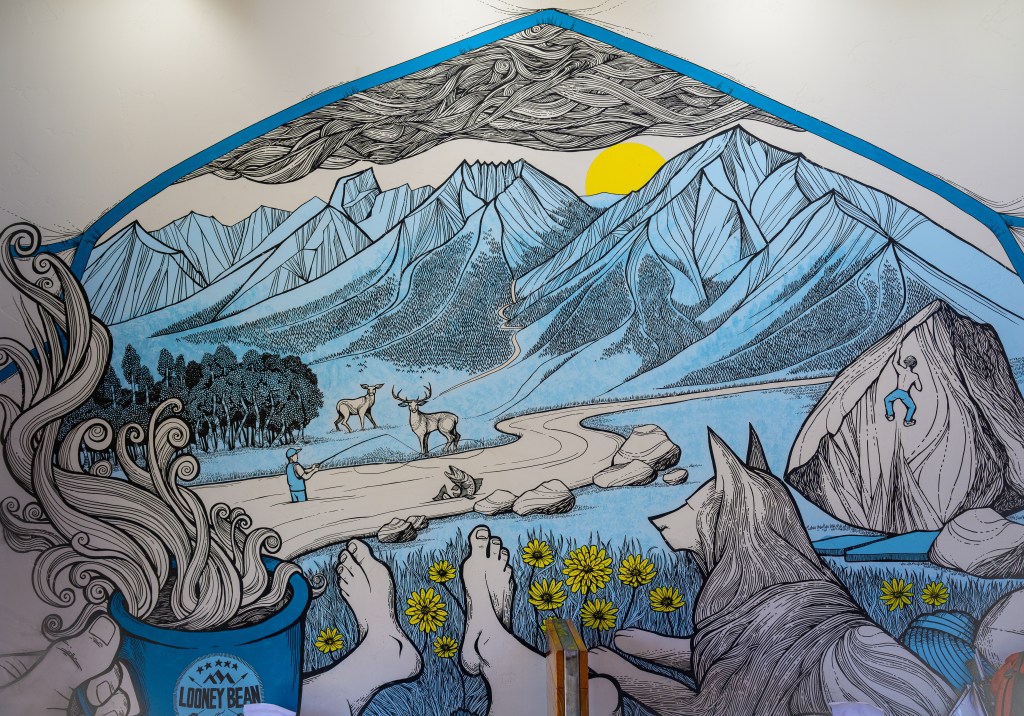 Artist David Titus imagined how these peaks look from the door of a tent; this fun painting covers a wall in Looney Bean of Bishop, a local coffee house.