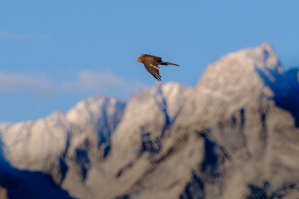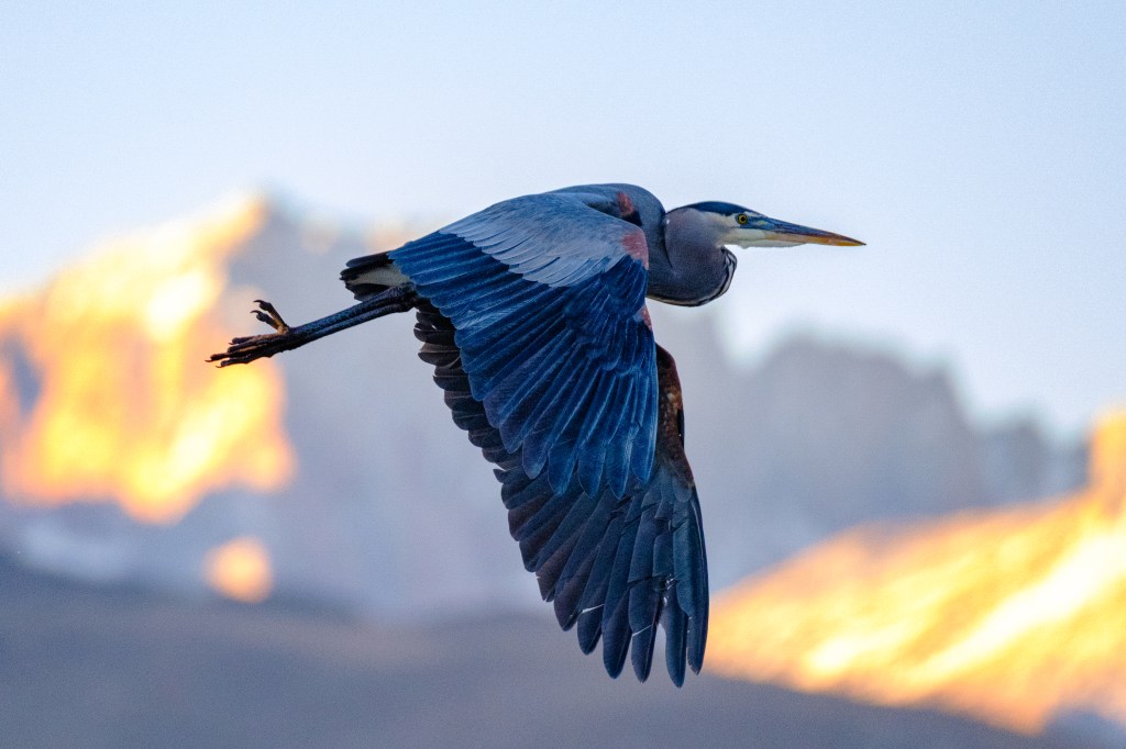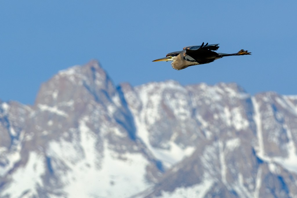 When I track a flying bird, the background sometimes includes distant peaks. In these pictures, the bird is perhaps a 100 yards away, while Humphreys is about 20 miles off. First, a Great Blue Heron flies near the Bishop Creek Canal.
