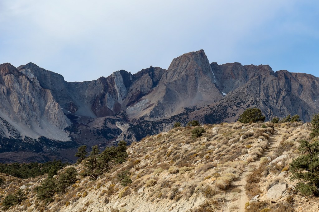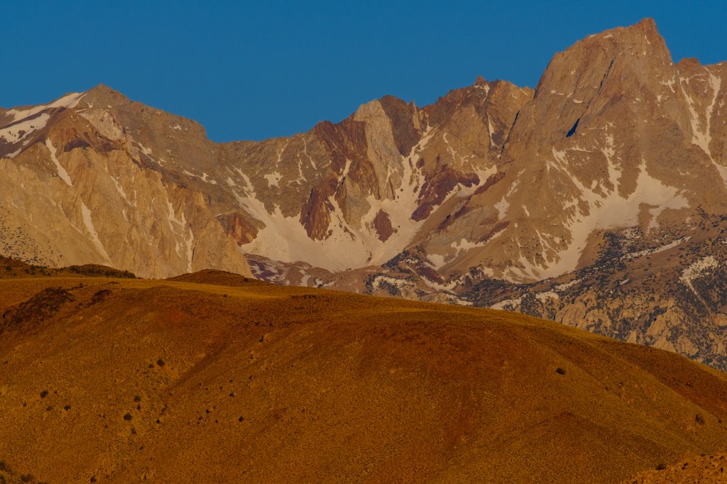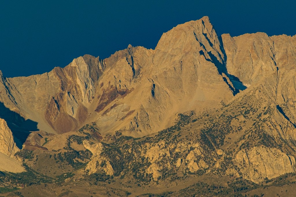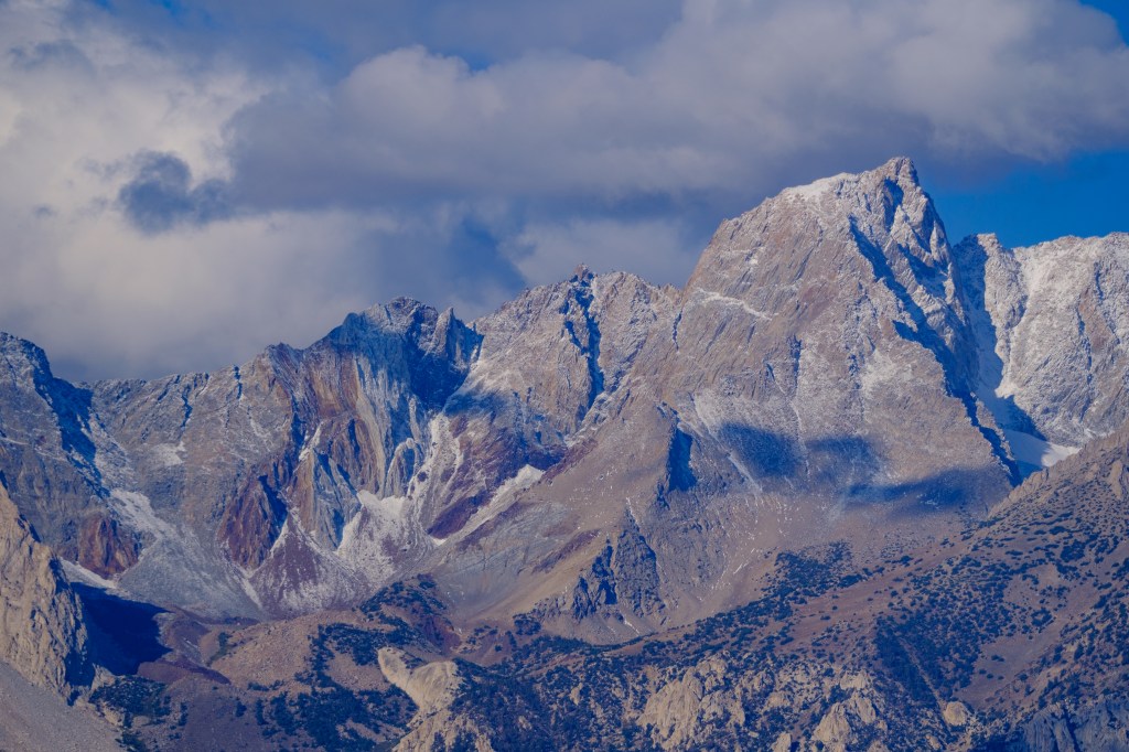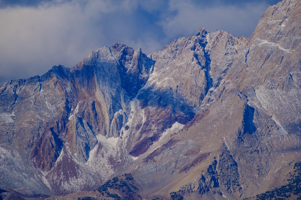 The next photo shows more detail of Humphreys before any snowfall. To the left of Humphreys, a massive tower of gray sedimentary rock reaches the skyline, sandwiched between layers of red rock. In some photos you can see the sedimentary layers have been upended ninety degrees. The Sierra is mostly granite, but throughout the range are slabs of layered rock that have been twisted by colossal forces.
