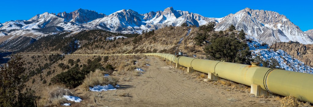 Water that drains from Mount Humphreys will eventually reach Los Angeles via the LA Aqueduct. Aside, of course, for a dribble that sustains Bishop. Los Angeles Department of Water and Power doesn’t care how that water gets to the valley; their intakes collect from all the streams. But Southern California Edison does care; they built large pipelines to move water from the slopes of Mount Humphreys into Bishop Creek, where it flows through power stations to create the juice that lights our town. The first set of photos was taken from roads near those pipelines. The shot below is from early November. Humphreys is just right of center. The pipeline is about six feet high.