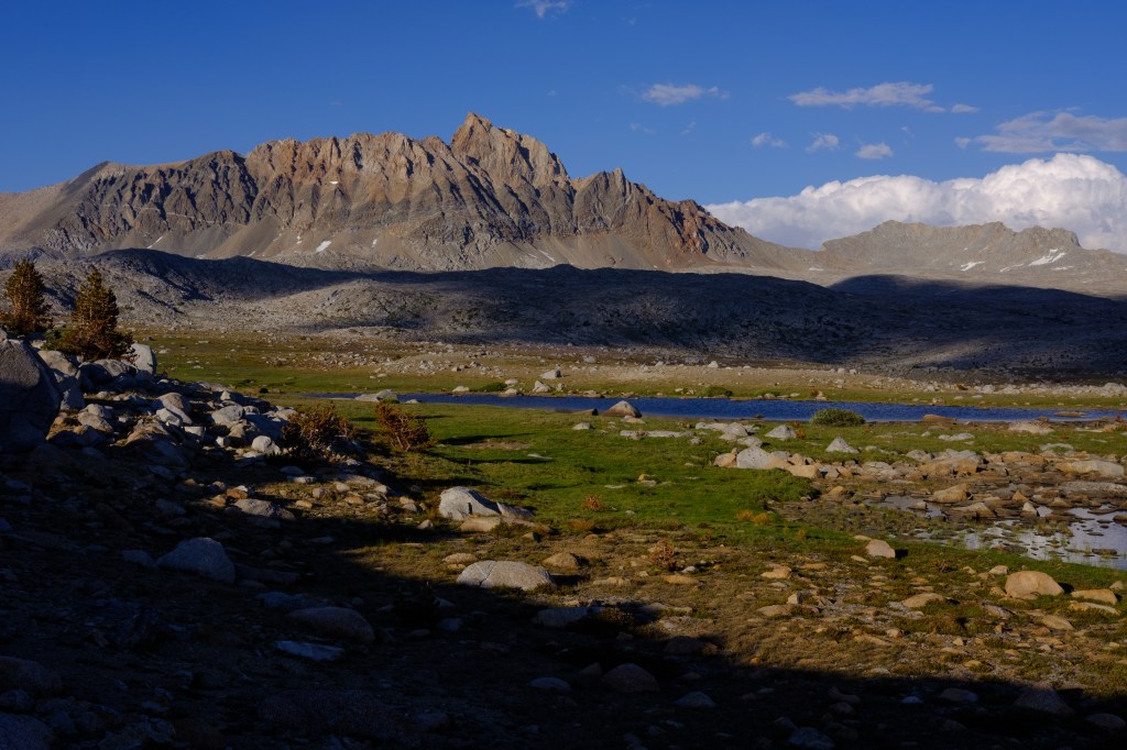 To see the west side of Mount Humphreys, it is easiest to hike over Piute Pass and drop into Humphreys Basin, a tableland of lakes, rocks, and meadows. The first photo shows Humphreys near the center, at 7 pm.